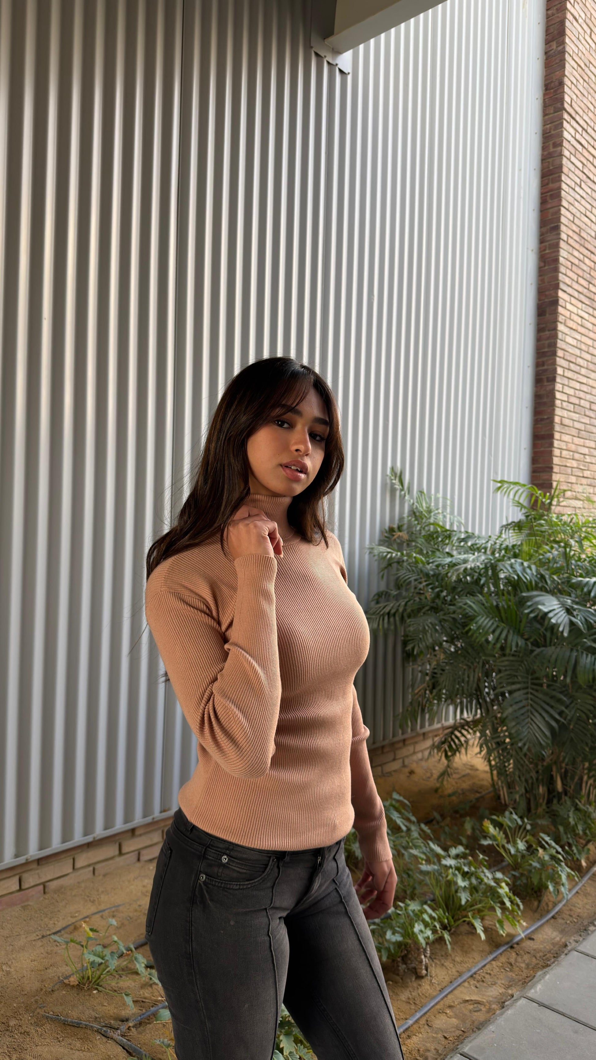 A refined essential turtleneck top crafted from soft rib-knit fabric. Designed with a clean silhouette and a high neckline, offering both comfort and understated elegance. A versatile wardrobe staple ideal for layering or wearing on its own.