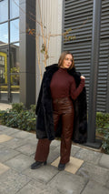 High-waisted wide-leg leather pants designed with a clean, straight silhouette. A statement piece that blends modern structure with effortless elegance.